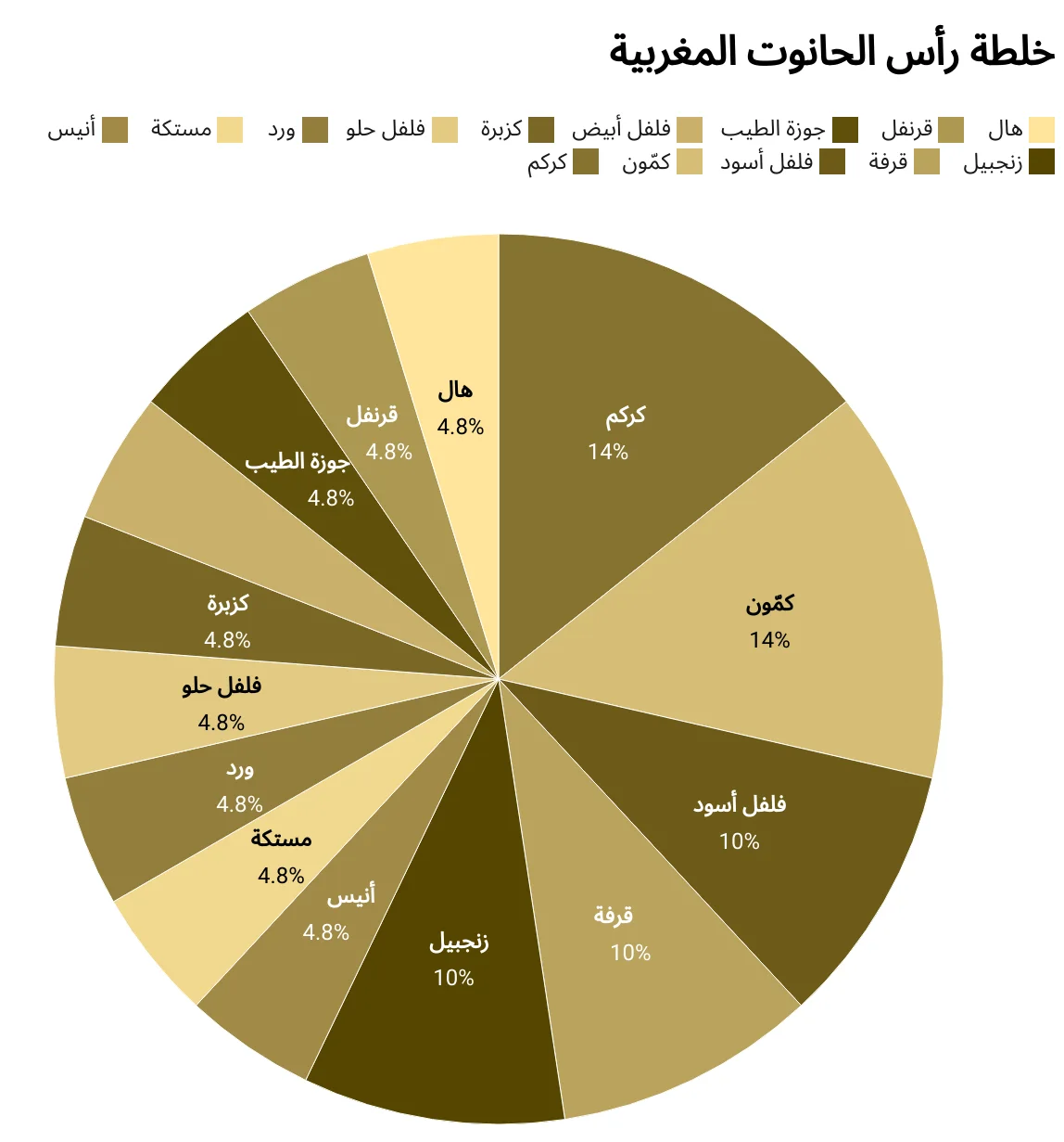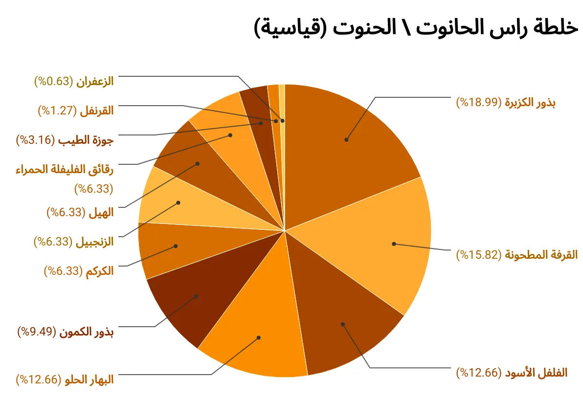 راس الحانوت ليس مجرد بهار، بل هو تاج التوابل الذي يضم خليطاً قد يصل إلى 40 نوعاً مختلفاً، وأحياناً أكثر من 100 نوع في بعض الوصفات القديمة. اسمه يُترجم حرفياً إلى “رأس الحانوت” أي أجود ما يقدمه العطّار من بهارات.