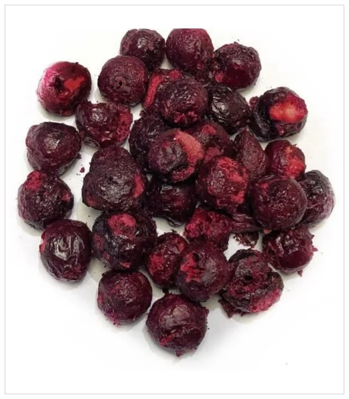 شرائح الكرز المجففة تُجفف على درجات دقيقة للحفاظ على لونها الأحمر الغامق ومذاقها الطبيعي اللذيذ.